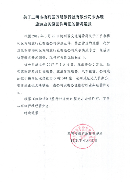 关于三明市梅列区万明旅行社有限公司未办理旅游业务经营许可证的情况通报