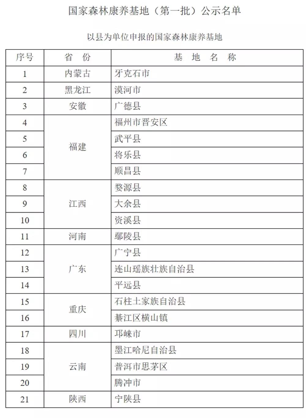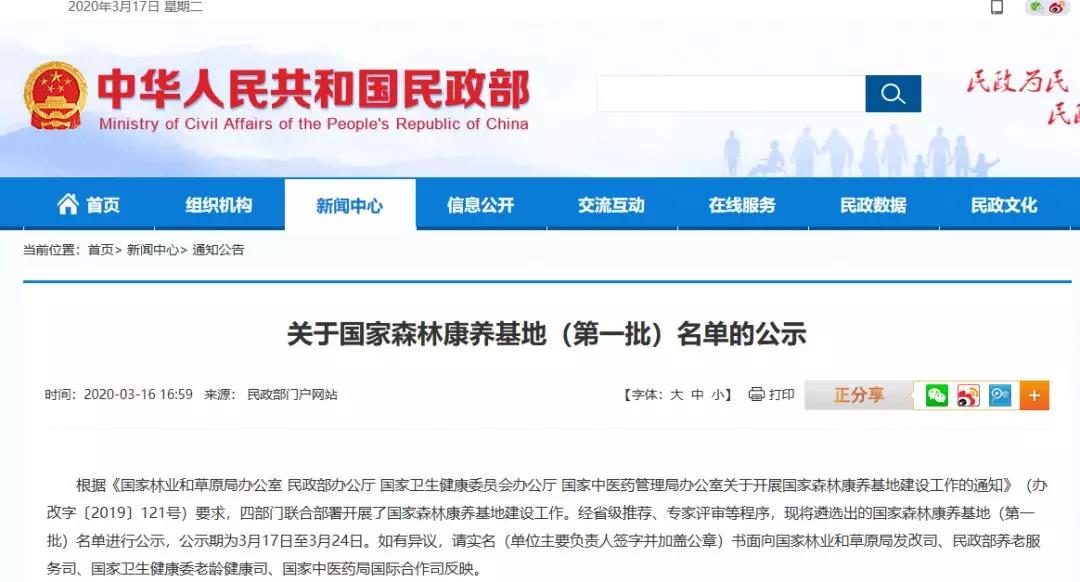 根据《国家林业和草原局办公室 民政部办公厅 国家卫生健康委员会办公厅 国家中医药管理局办公室关于开展国家森林康养基地建设工作的通知》(办改字〔2019〕121号)要求,四部门联合部署开展了国家森林康养基地建设工作。经省级推荐、专家评审等程序,现将遴选出的国家森林康养基地(第一批)名单进行公示,公示期为3月17日至3月24日。如有异议,请实名(单位主要负责人签字并加盖公章)书面向国家林业和草原局发改司、民政部养老服务司、国家卫生健康委老龄健康司、国家中医药局国际合作司反映。